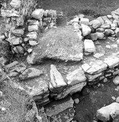 Bildet viser bygningsrester i hjørnet mellom østre ringmurs østside og sydfløyens østside. Sentralt i bildet ligger det såkalte kalkanlegget med to paralelle murrester med noe som ...