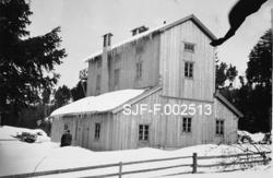 Subject Fabrikkbygning som etter eksteriøret å dømme må ha huset et retortanlegg for tørrdestillasjon av tyrived med sikte på produksjon av tjære, kol og kanskje terpentin eller andre biprodukter. Bygningen er oppført i bordkledd bindingsverk, og later til å ha vært umalt da dette fotografiet ble tatt. Den har et rektangulært grunnplan og et karakteristisk eksteriør med et to og en halv etasjes midtparti med saltak omgitt av lavere (entaesjes) «sideskip» med pulttak på begge langsider. To mennesker står ved ei todelt dør, om lag ved midten av det ene «sideskipet». Bygningen er omgitt av et enkelt gjerde med horisontale bord som er spikret til stolper. Snøen ligger djup omkring bygningen, og mangelen på ferdselsspor omkring anlegget tyder på at det neppe var særlig stor aktivitet her da den sesongen dette fotografiet ble tatt. Bildet er fra et album som har tilhørt familieselskapet som etablerte Østerdalens Tredestillasjoner A/S i Elverum. Denne bedriften skal ha hatt underavdelinger ved Kroken og Rasta i Stor-Elvdal. Det avbildete anlegget er antakelig det samme som finnes på SJF-F. 002614.