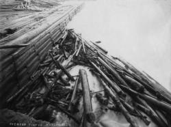 Subject Bakevje mellom bergrygg og skådam i tømmerkistekonstruksjon ved Sagafoss i Tinnåa i Notodden kommune i Telemark (da dette fotografiet ble tatt het kommunen «Hiterdal» [Heddal]). Fotografiet er tatt 4. juli 1907 «kl. 2 1/4», altså klokka 14. 15. Virket vi ser i forgrunnen er til dels tømmerstokker som later til å ha fått hard medfart i vassdraget før det nådde hit ned til Sagafoss, dels kvist og bark. I ei evje på baksida av skådammen lå det også tømmer da dette fotografiet ble tatt, til tross for at det antakelig var slike virkesopphopninger den fotograferte skådammen skulle forebygge. Tømmeret i bakgrunnen later til å ha vært atskillig mindre skadd enn det som ligger i forgrunnen. Dette fotografiet er blant de 30 opptakene Tinfos Papirfabrik leverte som bevismateriale i forbindelse med en tvist med Skiensvassdragets Fellesfløtningsforening i 1907. Striden hadde sitt opphav i «Tinnfoss-sveiva», en strømvirvel som hadde oppstått etter at papirfabrikken foregående vinter hadde bygd ny dam, økt kapasiteten på sitt vanninntak og tippet stein fra anleggsarbeidet i vassdraget under Tinnfossen. For advokaten til papirfabrikken var det et poeng å vise, at skader på fløtingsvirket kunne ha oppstått andre steder i vassdraget, som her. De knekte tømmerstokkene i forgrunnen, på et fotografi som var tatt ovenfor «Tinnfoss-sveiva» ble antakelig brukt i denne argumentasjonen. Mer om konflikten mellom Skiensvassdragets Fellesfløtningsforening og Tinfos Papirfabrik i rubrikken «Andre opplysninger».