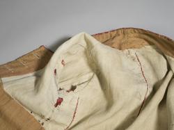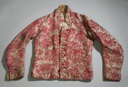 Håndsydd vest av ulldamask, fôret med to typer linstoff. Ryggsømmene er sydd med spilesøm. Vesten har ståkrage, dobbel knapphullrad (18) , trekte knapper (to ulike stoff) (16) - to ...