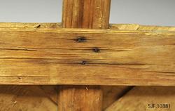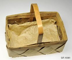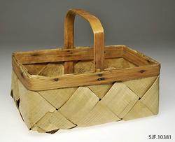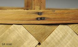 Hanken ligger på innsiden av de flettede sidene, og er festet mellom flettet side og indre kantspon. Hanken består av et tykkere spon som delvis er kløyvd i to. Spiker og stifter i kurvkant er rustne.