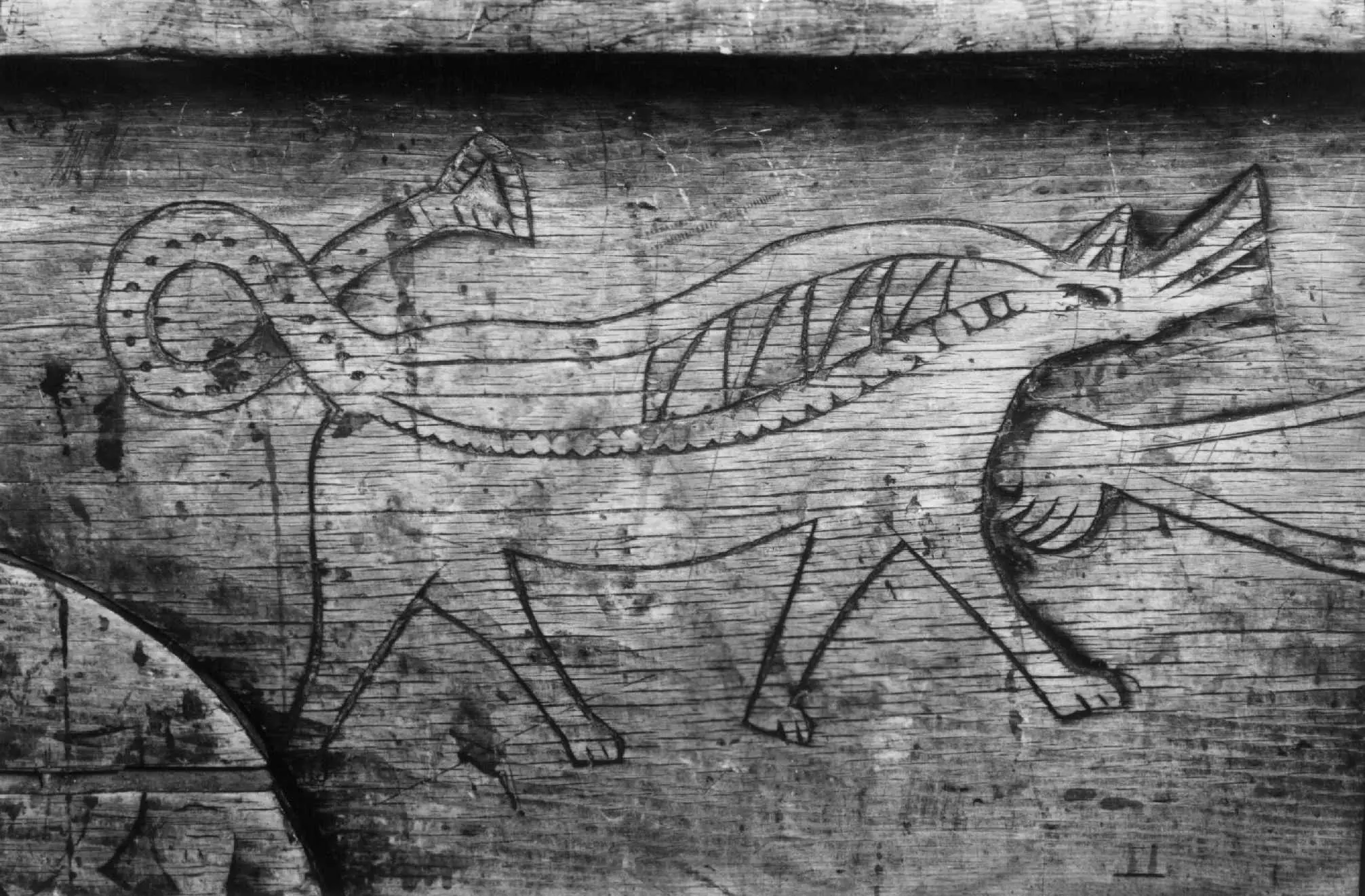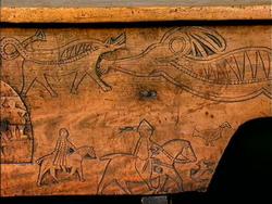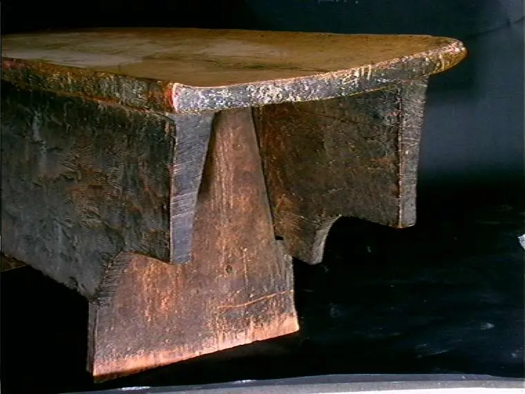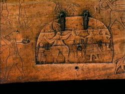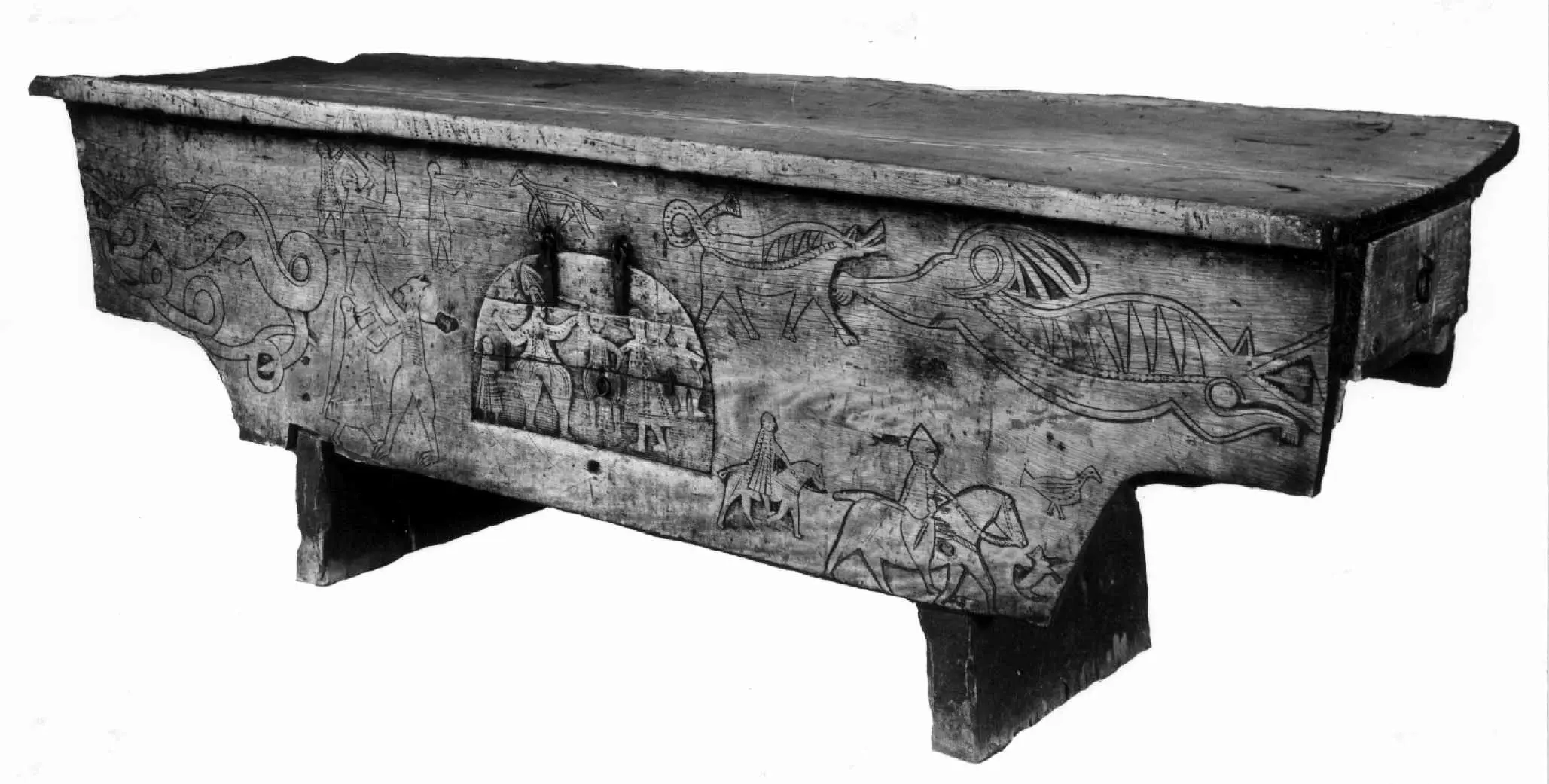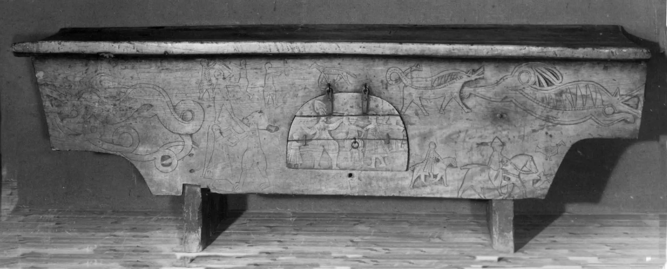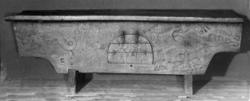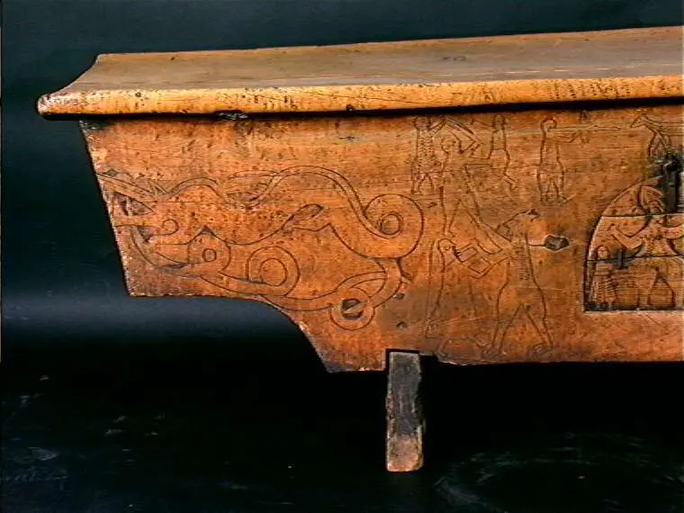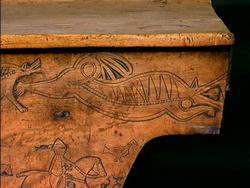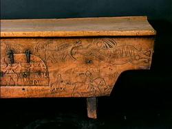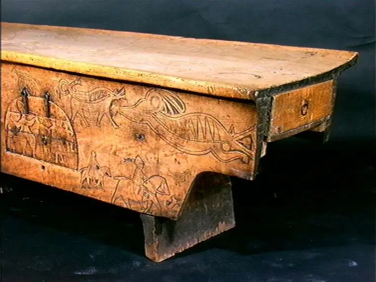Bordplate og sider til bordet et laget av én tømmerstokk. Bendelene er skåret som formen til innsiden og sikret med dømlinger. Bordet har en frontside med skurd og rispet dekor me ...