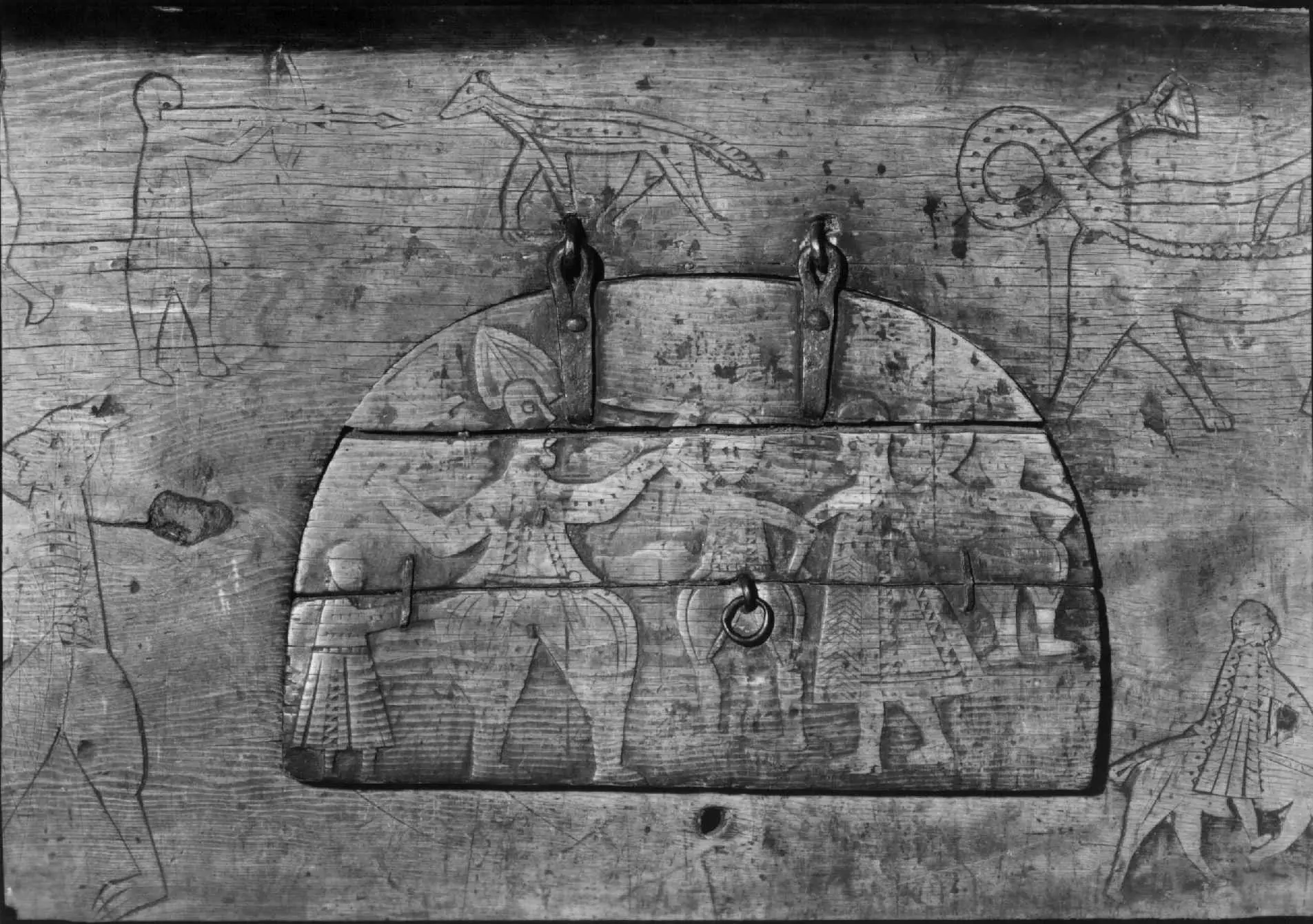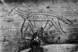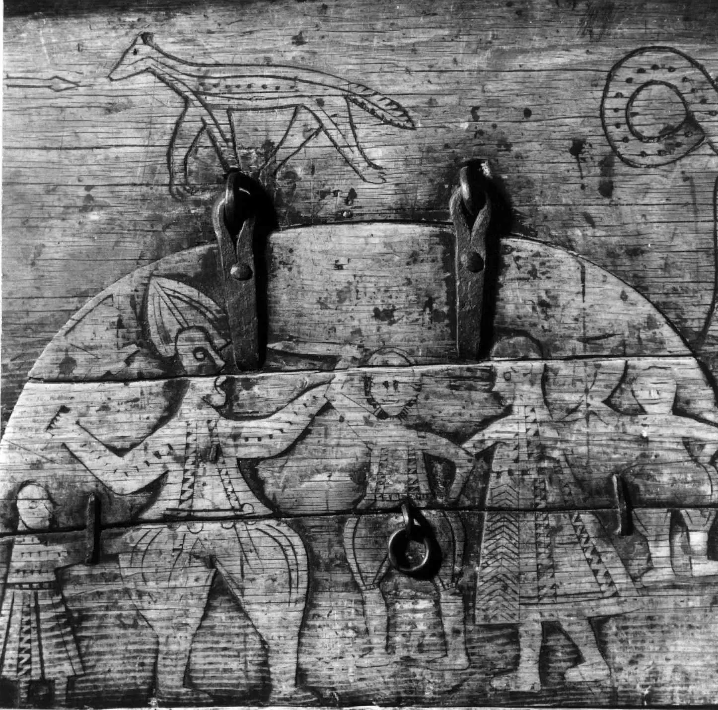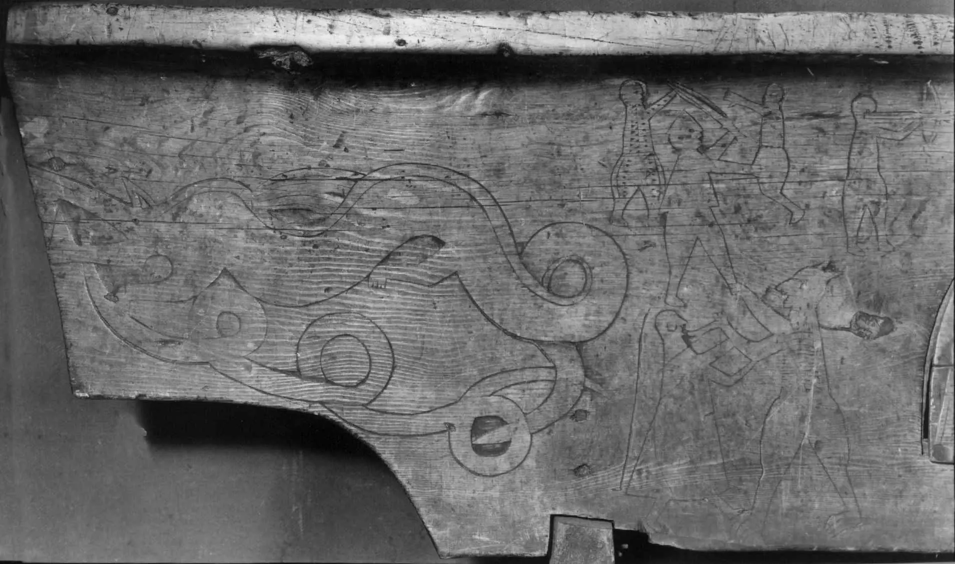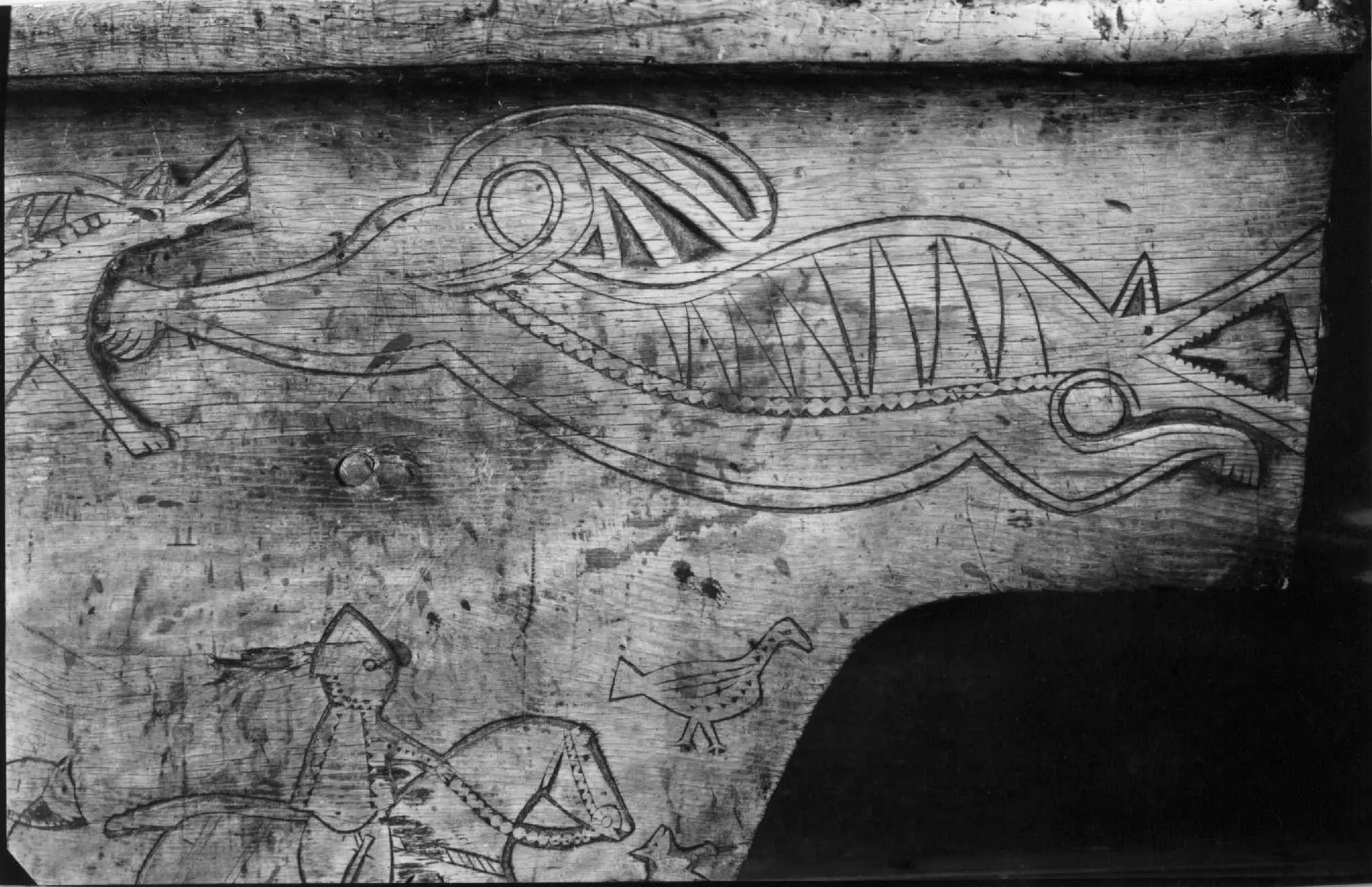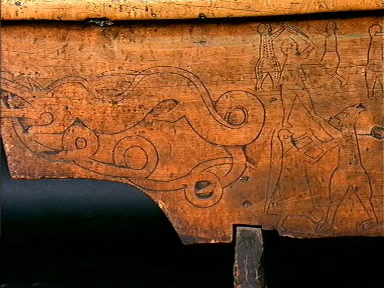 Bordplate og sider til bordet et laget av én tømmerstokk. Bendelene er skåret som formen til innsiden og sikret med dømlinger. Bordet har en frontside med skurd og rispet dekor me ...