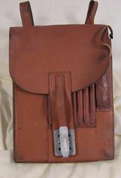 Form: Rektangulær m/2 stropper øverst med metallspenner. En blyantrest i ene rom. Lomme for annet skriveutstyr.En klaff for luking. Denne har på- satt dobbelte lærstropper samt metallluking. Utstyret har tilhørt de tyske tropper i Kragerø 1940-45.