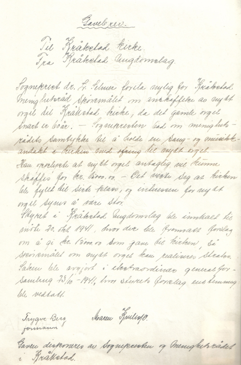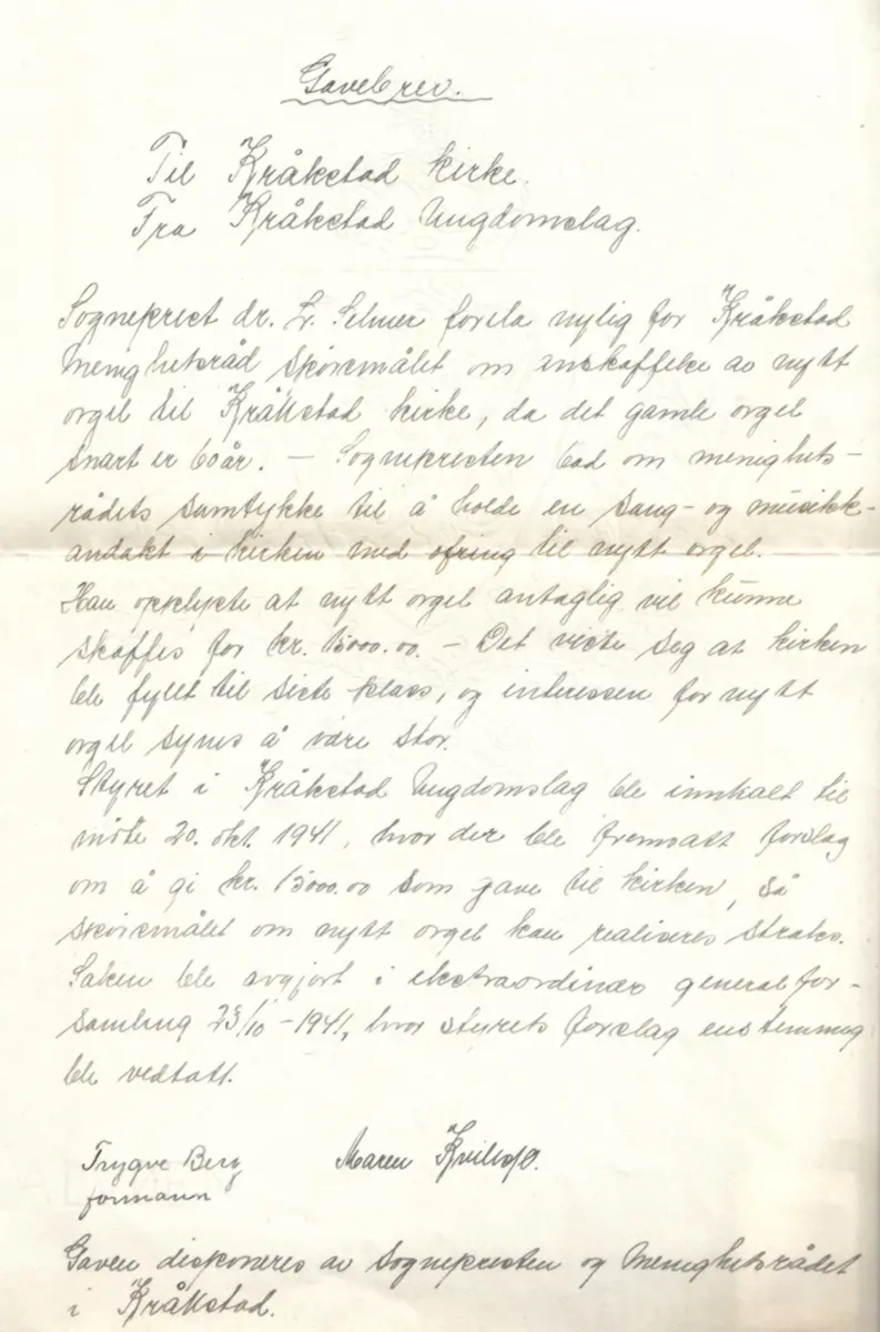 Den neste innføringen i protokollen er fra 1956. Ungdomslaget hadde noen midler som hadde stått urørt i mange år. I alt dreide det seg om i overkant av 5.000 kr. Spørsmålet var hva man skulle gjøre med disse pengene. Det ble besluttet at de skulle brukes til å kjøpe et flygel til samfunnshuset. På flygelet skulle det stå en liten plakett med inskripsjonen: ”Til minne om Kråkstad frilyndte ungdomslag og Ivar Haug.”