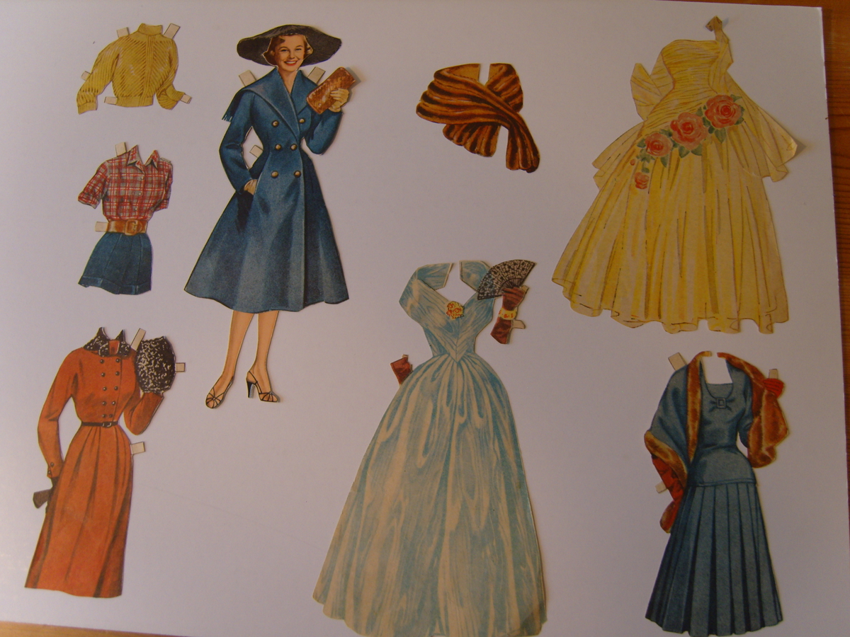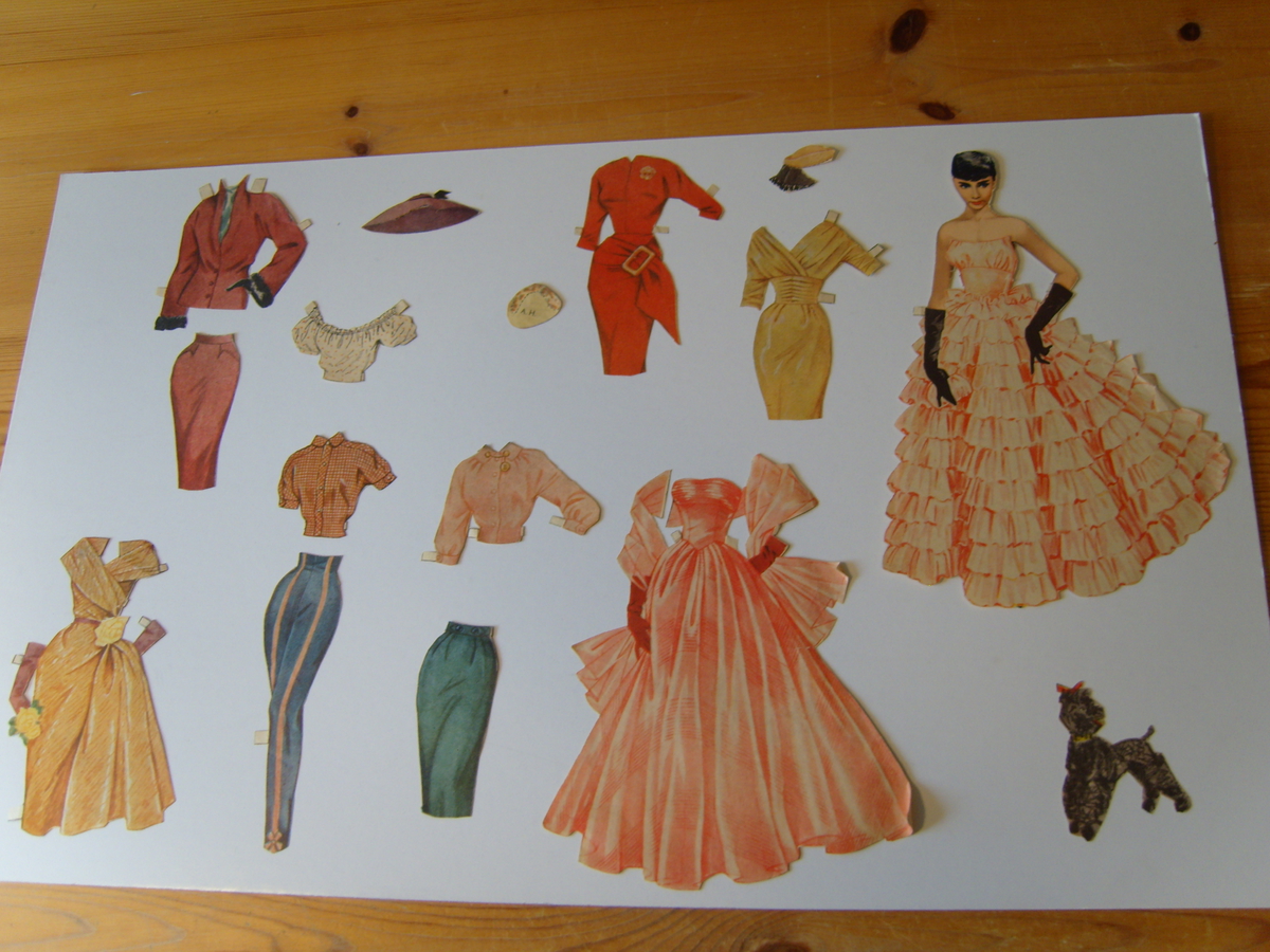 Kjendiseriet var ikkje oppfunne då, men me likte godt Doris Day, June Allison og Audrey Hepburn. Og Grace Kelly, både som filmstjerne og i brurekjole som fyrstinne av Monaco. Nett desse kom på trykk, og med nye kle kvar veke. Sjølve dokkene måtte forsterkast og limast på papir for ikkje å missa både føter og armar i alle kleskifte.