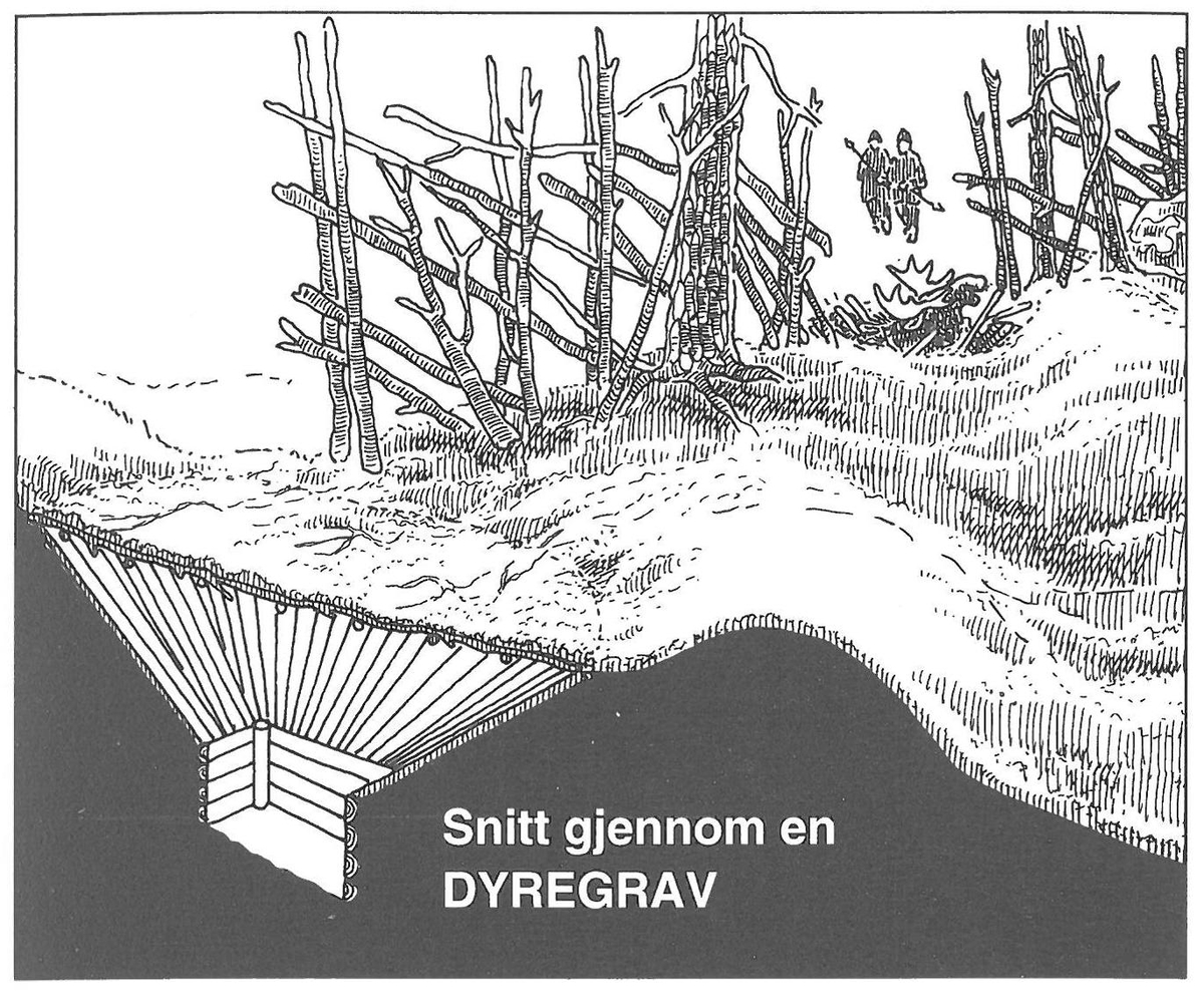 METODER OG DRIFT AV ET FANGSTANLEGG: For å effektivisere jakta ble flere fangstgroper anlagt ved siden av hverandre på rekke. Mellom gropene ble det bygget høye gjerder. Når man anla slike fangstanlegg på tvers av dyras trekkrute, kunne fangsten bli svært resultatrik.