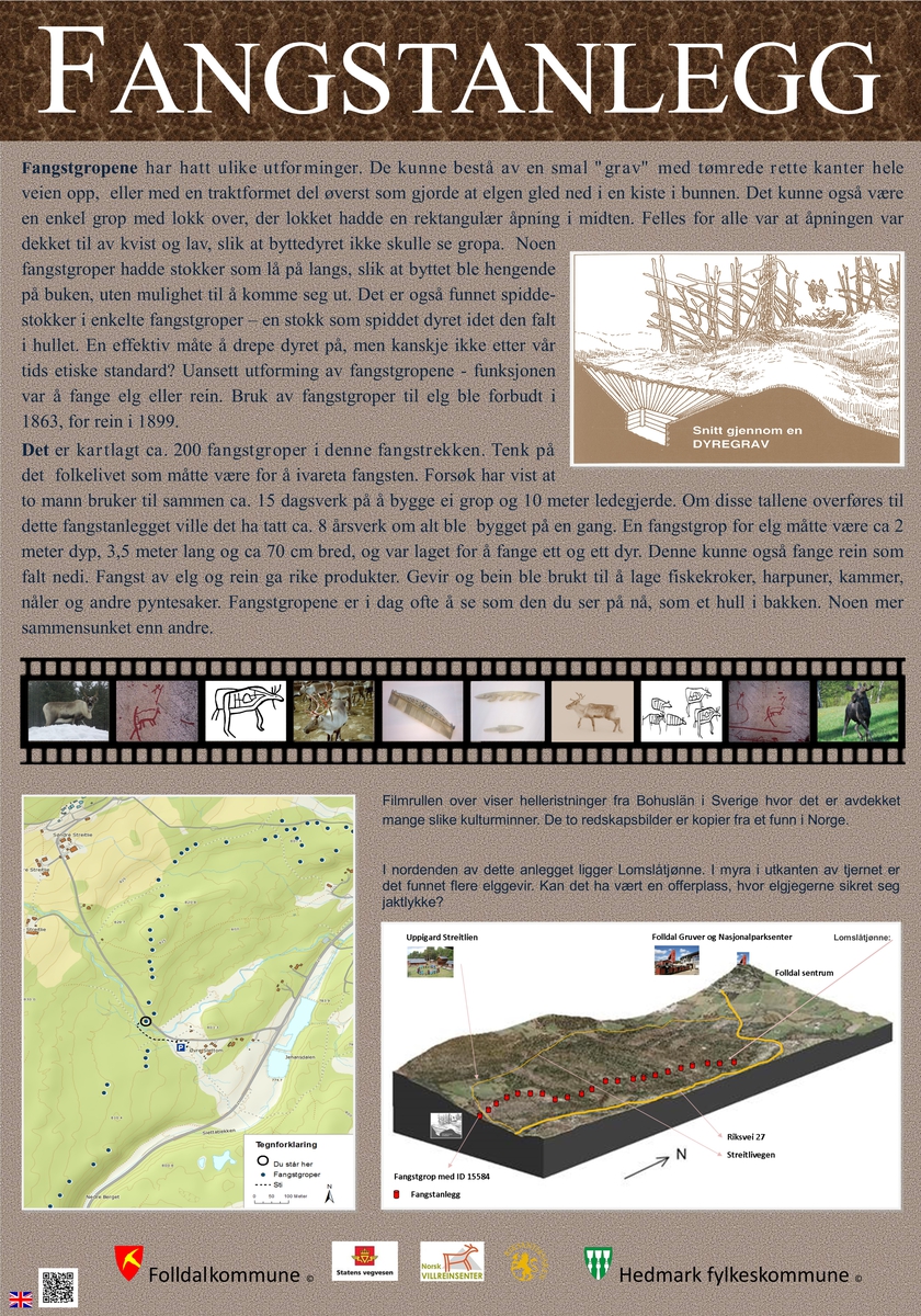 HISTORISK OVERSIKT: Helt siden de første menneskene vandret inn i det som i dag er Norge, var effektiv jakt og fangst nødvendig for å overleve. Akkurat når jegerne fant ut at groper i bakken kunne være en praktisk måte å fange elg eller rein på, vet vi ikke, men det finnes sikre dateringer tilbake til ca 1500 f.Kr. Fangstgroper for elg er et av skogens mest karakteristiske kulturminner. Selv om ikke alle fangstanleggene vi finner var i bruk samtidig, viser disse kulturminnene at det i perioder må ha vært stor aktivitet i skog- og fjellområdene i Folldal. Følg stien, og du vil få se ei fangstgrop. Den er en del av et anlegg med ca 200 groper. Tenk på hvor mange mennesker som må ha vært med for å grave, vedlikeholde og drive fangst i et slikt anlegg! Hvor lang tid det kan ha tatt å bygge dette anlegget, kan du lese på skiltet oppe ved fangstgropa.