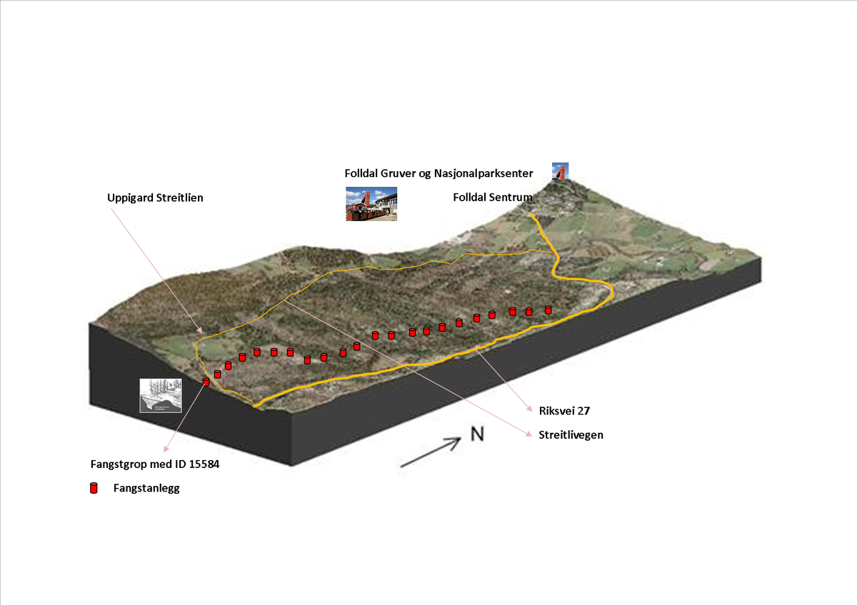 GEOGRAFISK PLASSERING: Fangstanlegget ligger langs nasjonal turistveg, og fangstgropa som er valgt til utstillingsgrop ligger langs vegen opp til Bygdetunet i Folldal, en kort kjøretur fra Folldal sentrum.