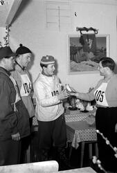 Arbeider-Avisa 11.02.1954 har brukt bilde 3 med følgende bildetekst: "...Harald Helland (t.v.) overrekker Lars Høyem et symbolsk kuhorn, mens Rolf Stokke blåser fanfaren...".