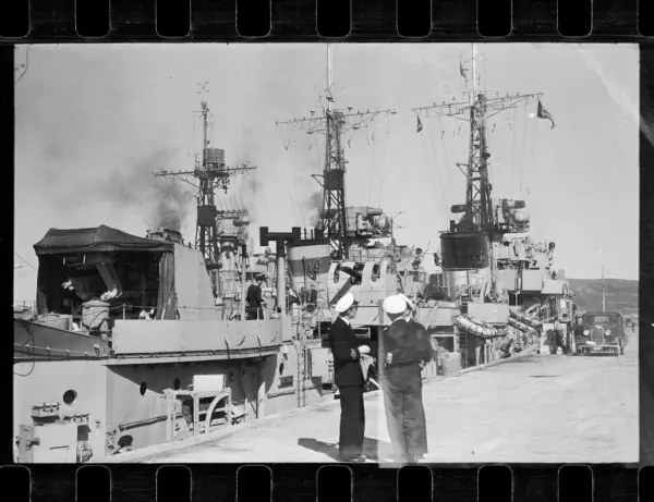 KNM Oslo.(KNM er forkortelse for "Kongelig Norsk Marine". Navnet Oslo kan sees rett bak offiseren i svart, nesten nede ved kaikanten. De to andre er enten KNM Trondheim - KNM Bergen eller KNM Stavanger. Disse var av typen C-class destroyer, kjøpt inn fra Storbritannia i 1945.