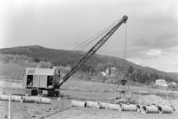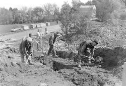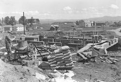 03: "Et av de områder hvor byggevirksomheten er aller livligst er mellom Rønningen gård og Persauneleiren. I forgrunnen på bildet ser vi en kjellermur for et bygg som reises for to Vinmonopol-funksjonærer. I området lengere bak på bildet er man i gang med å grave opp 16 tomter som dels disponeres av byggelag og dels av private byggherrer. I bakgrunnen ser man låven på Rønningen gård som nesten er den eneste førkrigs begyggelse i dette området".