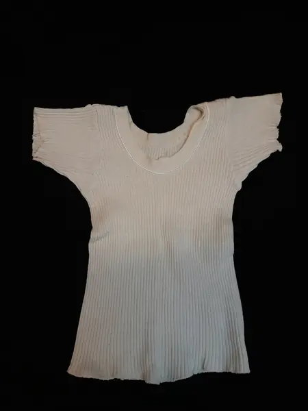 2 baby skjorter som vi nok har brukt alle tre ungene på Sentralen (i Furnes), vi er alle tre født under krigen. Kari 1940, Einar 1943 og Randi 1944, ungene til Ragnhild og Konrad Helgesen. Ragnhild var stasjonsholder på Furnes telefonsentral og Konrad hadde lastebil med leievognsbevilgning.