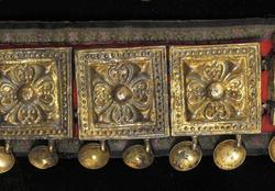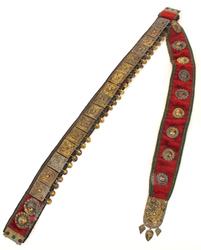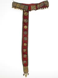 Beltet foret med rødt bomullsstoff med sorte prikker. Gehenget foret med sort silkebånd, blomsterranke i rosa og tunget rosa kant.
