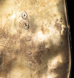 Bergens bystempel, guardeinstempel: H/W i oval (H over W) (Christen Hoff, guardein 1821 - 1860). Mesterstempel: PMB i liggende oval (Peter Michael Blytt, 1790 - 1836). Månedsstempel 8 /M i oval = 8. måned, august.