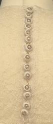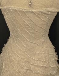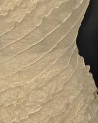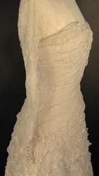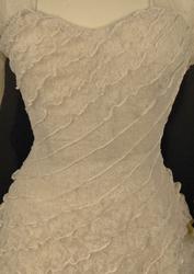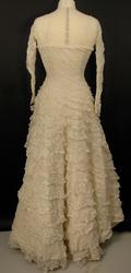 Helklipt, figursydd. Ermer og bærestykket klipt i ett. Rund hals bak med 22,5 cm lang splitt og 14 knapper med sydde trådhemper. Foran er halsutringingen rett nedover 18,5 cm fra skulderbredden ved halsen og går ned under bryststykket på kjolen. Fra bærestykket (som er foret med bobinett) er kjolen foret med tykk, blank silke. Utenpå er påsydd bobinettkapper som går på skrå fra venstre og ned mot høgre. Størsteparten av overdelen og hele skjørtet er blonden sydd på bobinettstoff uten mønster. Underskjørtet er da løst og har ei snor innsydd i folden nede for at kjolen skal føre seg penere. Glidelås i siden, hekter og sydde hemper på overdelen. Erme: Skinkeerme med 12,5 cm lang splitt ved håndleddet og 7 knapper, sydde knappehemper. 6 små innsydde legg på underarmen for bue av ermet. Skjørtet er utsvingt og har ein vidde nede på ca. 668 cm. Vidden på underskjørtet 470 cm. Kjolen er 19 cm lengre bak enn foran.