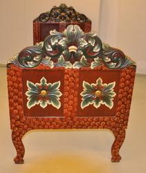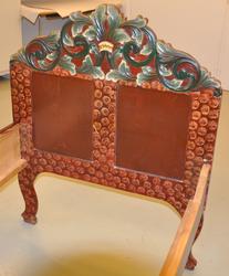 Seng med to sengegavler og to sidevanger. Den ene sidevangen er skåret ned på et lavere nivå. Ryggavlen er høyere enn fotgavlen. De har begge to fyllinger og krone prydet med akant ...