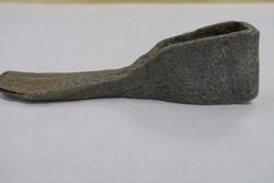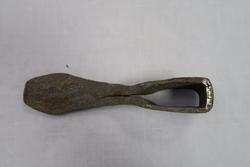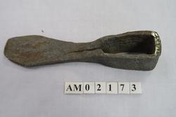 Hjemmesmidd jernhakke med innleggsstål. Jernet er brettet rundt skaftåpningen, det er lagt herdbart stål mellom. Hakken er hamret sammen (sveiset) på ambolt. I spissen er hakken stuket og sveiseskjøten er åpen både i spissen og fra skaftåpningen mot spissen. Dette tyder på mindre vellykket sveising, herding eller begge deler.