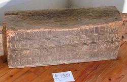 Tømmerstok, rimeligvis fra en Bindingsværks døraapning af en ældre Kirke i Solum, nedrevet omtrent 1760, med følgende, i ophøiede Bokstaver, latinske indskrift: " ...