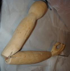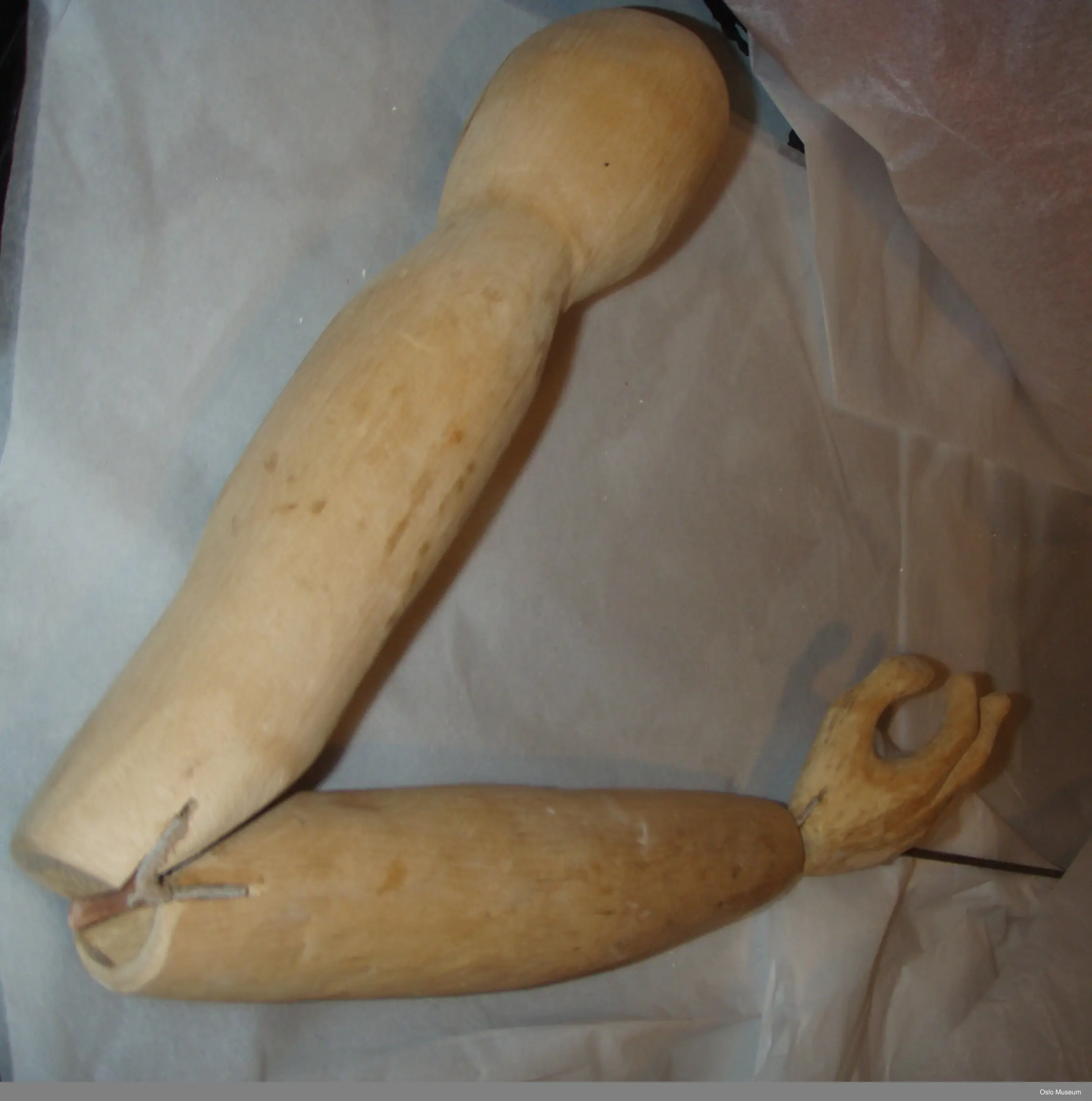 Brystkassen er hønsenetting. Farget gasbind i blå og rosa er limt på. Armene er i tre og bevegelig i skulder-, albue- og håndledd. Skinnlapper mellom treverket danner leddene.