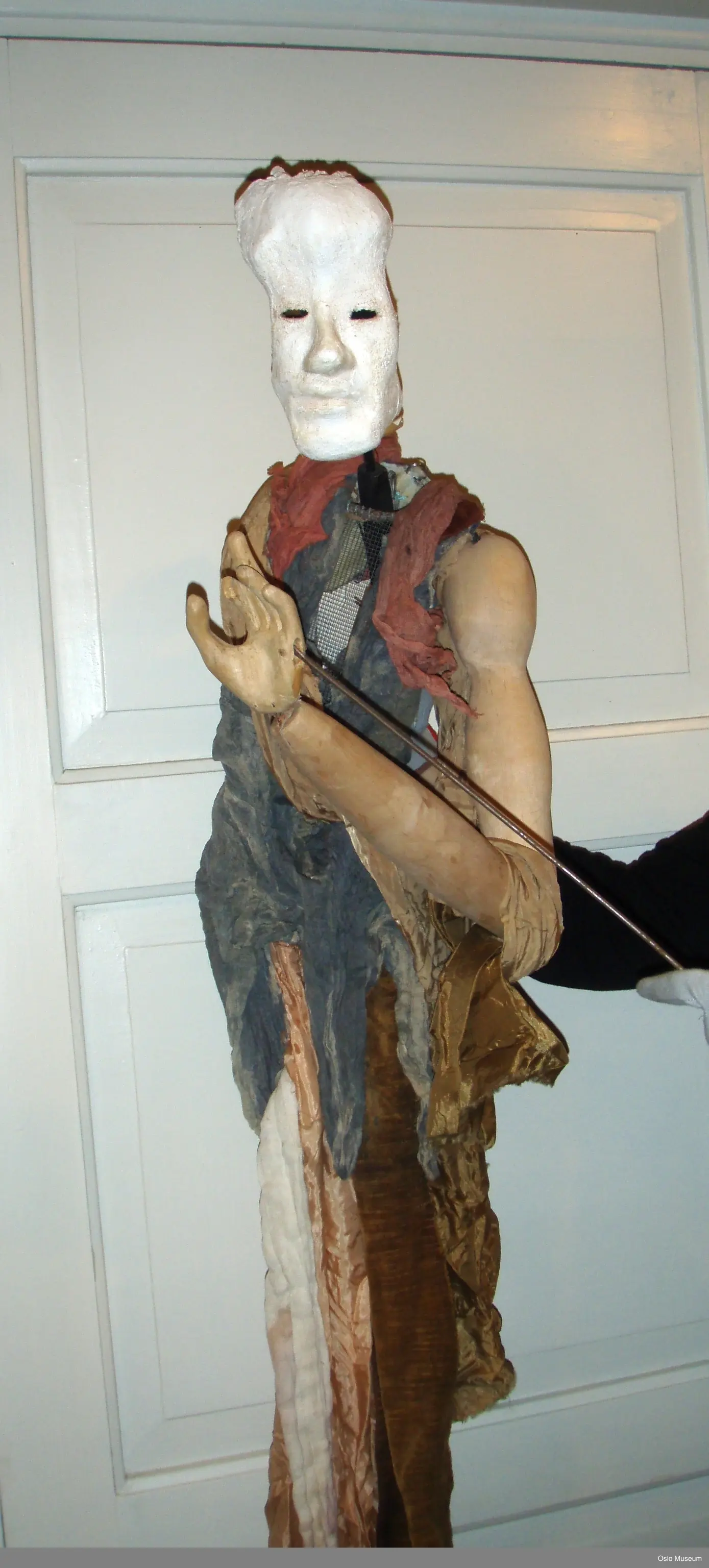 Ansiktet er gips og gasbind. Håret er stål som er bøyet og formet med strimler av gasbind og gips rundt om på hodet. Inne i masken er det sort plast og teip. Hodet står på en trestang som er festet med plasttråd. Trestangen går ned gjennom brystet som dukkeføreren kan bruke til å bevege hodet med.Trestangen er festet med stål og hemper.