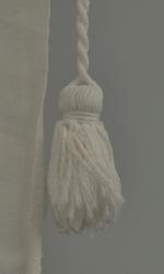 Forkle går fra livet og ned. I øvre kanten er det sydd en løpegang for bånd, ca. 1 cm brei. Ei tvunnet bomullssnor med dusker i endene er tredd inni løpegangen. Nedentil er stoffet ...