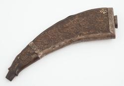 Snushorn av horn med bunn og sidebeslag av tinn. Hornet er dekorert på flatsidene med stiliserte blomsterranker. Munningen er formet som en åpen dragekjeft. Den korteste smalsiden har rankedekor på beslaget.