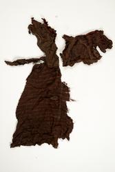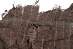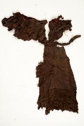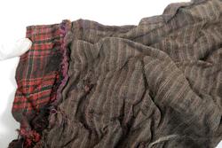 Svært utslitt del av ein stakk med linning, nederkant og ei metallhekte i eine enden av linning. Nedanfor denne delen av linning er det sauma fald som truleg er splitten midt framme på stakken. Av tre ulike verkensstoff, lerretsbinding med bomull i renning, ull i innslag. Stripete stoff i brun og lilla, svært utydeleg lillafargar. Fleire små hol etter mus, har vore nytta som stappefille.