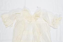 Lang dåpskjole i hvit bomullslerret med påsydde kjøpeblonder. Livstykket er sydd av to lag med tynn bomullslerret. Sydd til skjørtet med en bred linning. Ermer sydd rett i, med rynker langs hele ermeåpningen.