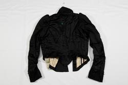 Kjoleliv til skjørt NBF2017-1494 i svart silkesateng med skrålagte folder og kjøpeblonder i svart. Foret med trykt bomullsfor. Tilbaketrukne sidesømmer og søm midt bak. Tosømsermer. Tre og to spiler på hver side midt framme. Tre spiler på hver side av ryggen (i sidene). Høy krage i halsen, som er avrundet ned mot midt framme. Lukking midt framme med en tett rekke hekter, 24 stk. Tre legg og en bred blondekant på skrå over brystet. Skrå lukning med overlivet på venstre side. Fire hekter har trolig vært festet på i tråhemper på høyre side av livet, på skrå. Noen rester er så vidt synlige. Livet er trolig ikke omsydd. Livet har i siste del av bruken vært brukt nedi skjørtet, tydelig på grunn av bøy i spilene og de to øyehektene midt bak på livet hvor stakken/køen har hengt. Rynket ermetopp.