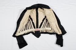 Kjoleliv til skjørt NBF2017-1494 i svart silkesateng med skrålagte folder og kjøpeblonder i svart. Foret med trykt bomullsfor. Tilbaketrukne sidesømmer og søm midt bak. Tosømserme ...