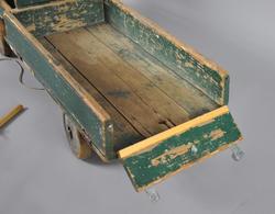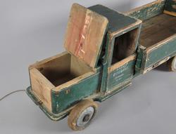Håndlaget lastebil av tre. Består av frampart og lasteplan, samt bevegelige hjul. Lastebilen har en grønn grunnfarge med røde dekorstriper. Malingen er avslitt flere steder. Lasteplan og panser er hengslet slik at det kan tippes. Bak- og sidedør på lasteplanet er også hengslet slik at de kan legges ut. På framsiden står det en pinne ut på høyre side, på venstre side skal det være en tilsvarende pinne, men denne har knekt. På framsiden er det festet en tråd med pinne i enden, for å dra lastebilen.
