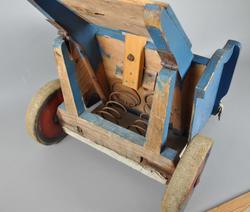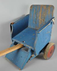 Håndlaget trilleav tre. Består av sete på to hjul, lærreim til belte, fotstøtte og draspak. Hjulene er av tre, og kapslene er malt røde. Setet står på to fjæringer fra madrass. Ned ...
