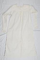 Nattkjole i hvit bomullslerret med påsydd blonde langs halsåpning og mansjetter. Bærestykke med firkantet halsåpning påsydd bomullsblonder, engelsk blonde. Ermene er satt rett i og er sydd med to sømmer i indresøm. Ermet kan være forlenget, med en søm tvers over nede på underermet. Splitt og mansjett med knapp og knapphull. Påsydd bredt blondebånd på mansjettene.