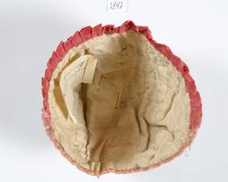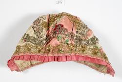Dåpslue. Av rosa og hvit silkedamask med brosjert blomstermønster i to ulike rosa nyanser og grønt. Dekorert med metallkniplinger, i både sølv og gull. Smal rosa silkekanting rundt ...
