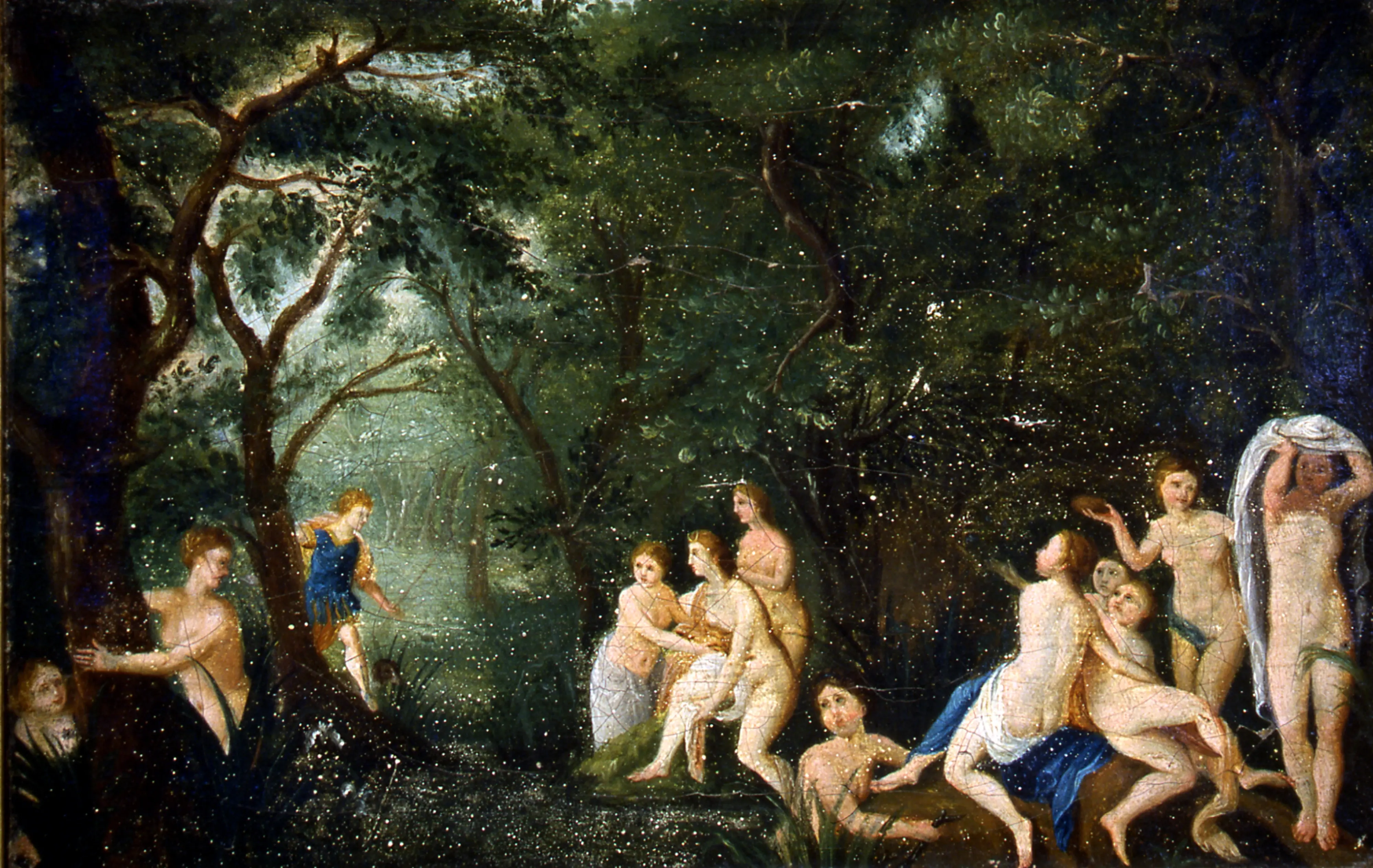 Motivet er Diana og hennes nymfer som overraskes av Actaeon (i blå drakt) mens de bader. Ovids Metamorfoser